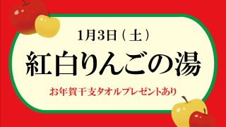 お知らせ1月3日(土)の初営業はりんご湯 1月3日は紅白りんごの湯。山形県のりんごをふんだんに使用します。 当日は中学生以上のお客様先着500名様に、 白水湯・萩の湯・寿湯・薬師湯4店舗コラボお年賀干支タオルをプレゼント! 2025.12.25お知らせ