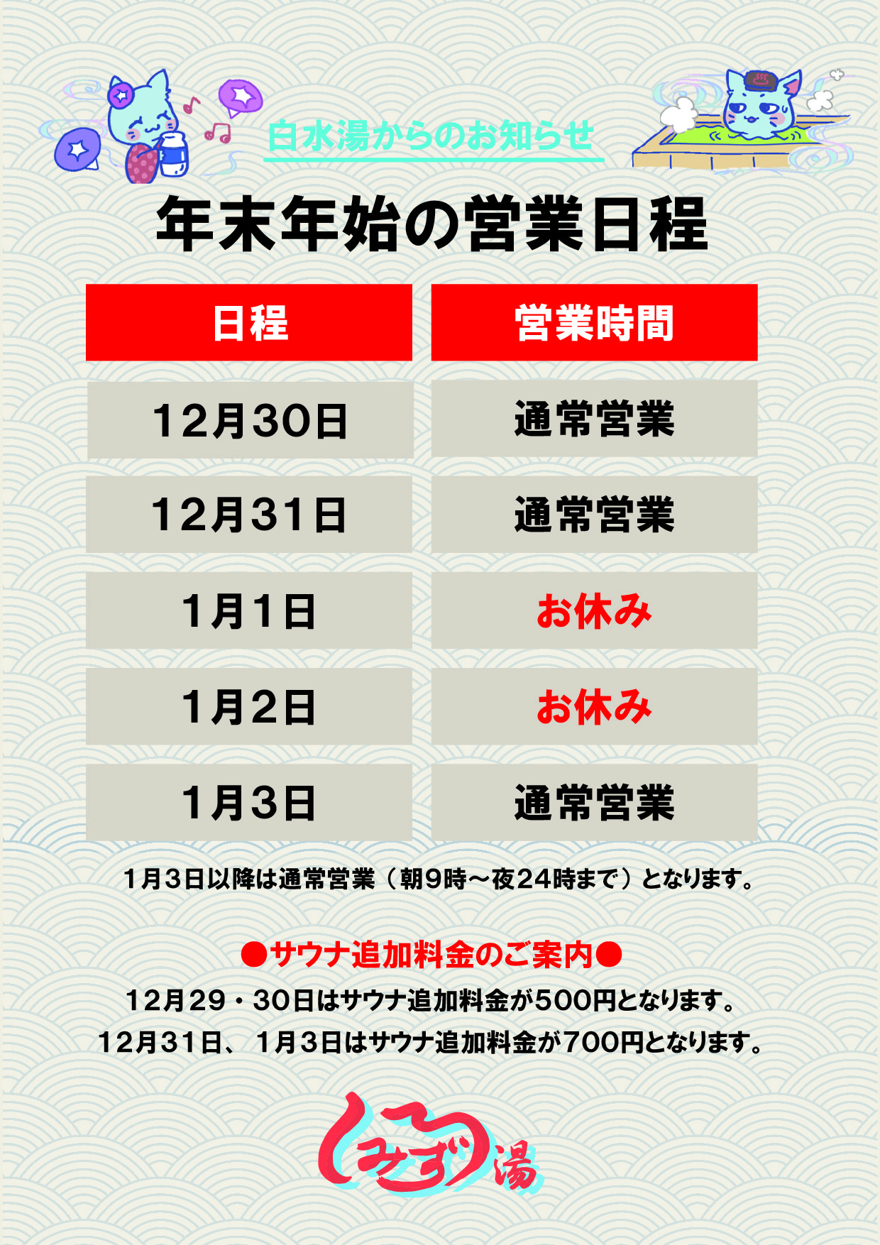 年末年始の営業時間のお知らせ お知らせ X Facebook はてブ Pocket LINE コピー 2025.12.15年末年始の営業の知らせ12月31日(水)まで通常営業、 元旦・1月2日はお休み、 1月3日以降から通常営業となります。●12月29・30日はサウナ追加料金が500円となります。 ●12月31日、1月3日はサウナ追加料金が700円となります。