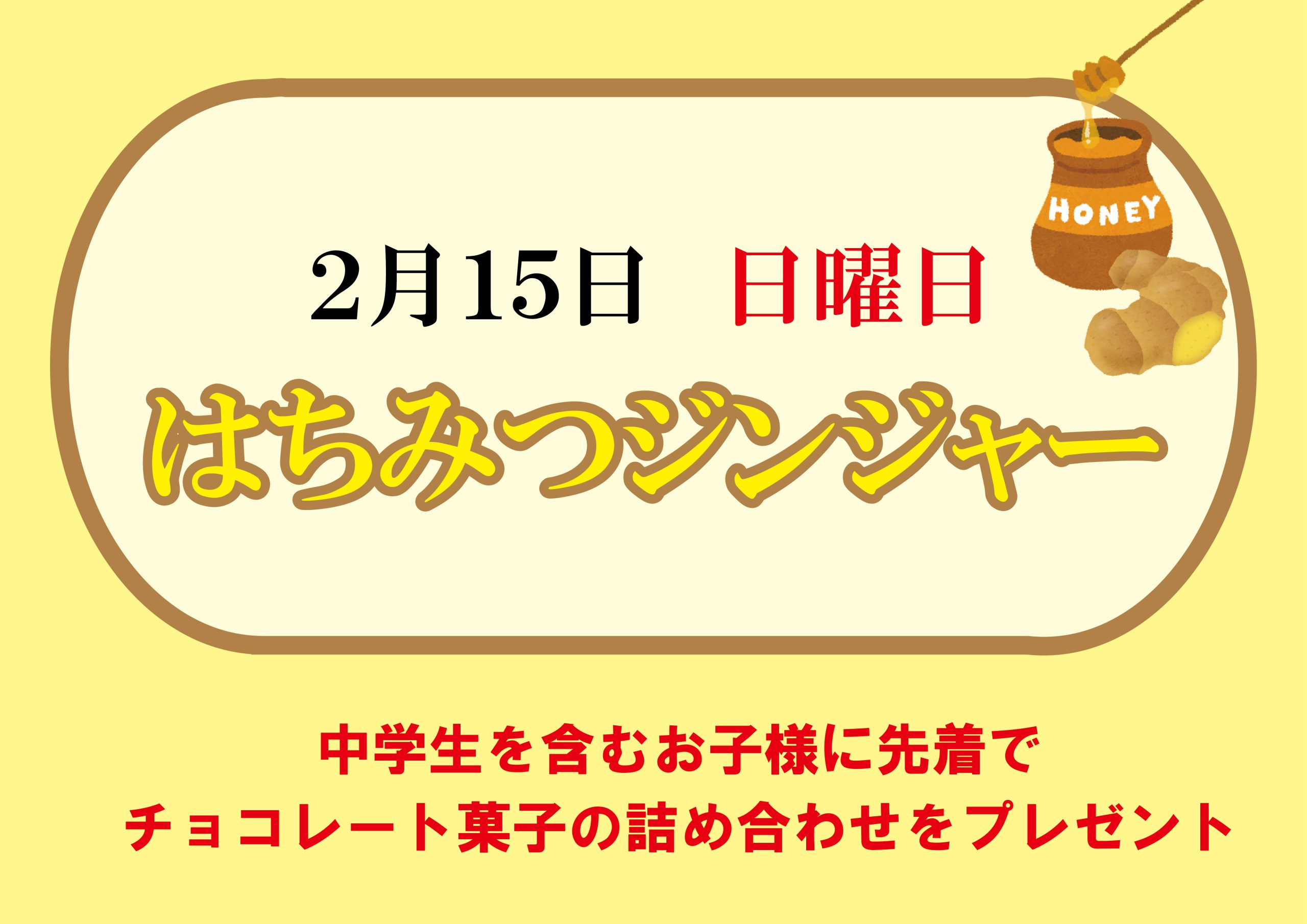 2月15日(日)は、はちみつジンジャーの湯 お知らせ X Facebook はてブ Pocket LINE コピー 2026.01.302月14日(土)15日(日)は中学生を含むお子様、各日先着20名様に、 チョコレート菓子の詰め合わせをプレゼント。そして15日(日)ははちみつジンジャーの湯になります。 まだまだ寒い季節は続いておりますが、はちみつジンジャーの湯で、 ポカポカ温まってインフルエンザを吹き飛ばしましょう!