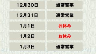 お知らせ年末年始の営業時間のお知らせ 年末年始の営業の知らせ 12月31日(水)まで通常営業、 元旦・1月2日はお休み、 1月3日以降から通常営業となります。 ●12月29・30日はサウナ追加料金が500円となります。 ●12月31日、1月3日はサウナ追加料金が700円となりま... 2025.12.15お知らせ